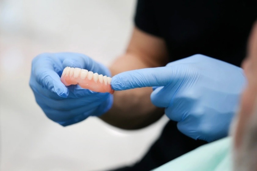 欠損部位を入れ歯で補う方法です。保険適用のものもあり、比較的短期間で対応できますが、インプラントに比べると噛む力が弱く、異物感や審美性で劣る場合があります。部分入れ歯の場合、周囲の歯にバネをかけることが一般的です。